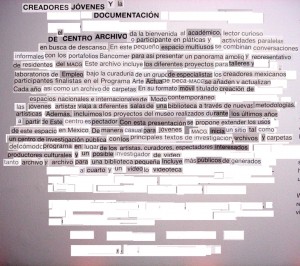 Este archivo incluye los diferentes proyectos para talleres y laboratorios de empleo bajo la curaduría de un grupo de especialistas. Los creadores mexicanos, participantes finalistas en el programa arte actual de beca-MACG se añaden y actualizan cada año, así como un archivo de carpetas en su formato móvil titulado creación de espacios nacionales e internacionales de modo contemporáneo.